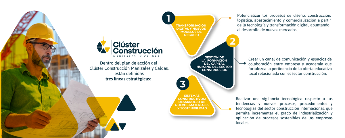 Nuestro Clúster es una vía para el desarrollo de proyectos e iniciativas en conjunto con las empresas, el sector público y la academia que transforma el sector de la construcción en la región por medio de la adopción de nuevas tecnologías, la formación especializada y la sostenibilidad.